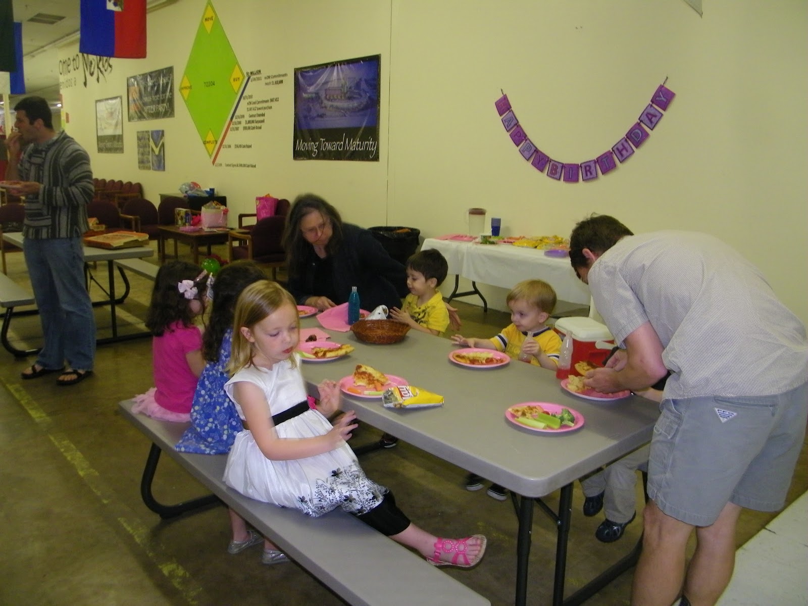 so, after a little bit of minor panic last night, we came up with plan b. the party was at mosaic church, which is where we have teen mops. i was so thankful they said yes - and i think it worked out great. the kids played on the playground there (which is indoor), chased balloons, played fancy-freeze-tag, ate pizza, ate cake. what more can you ask for, right?